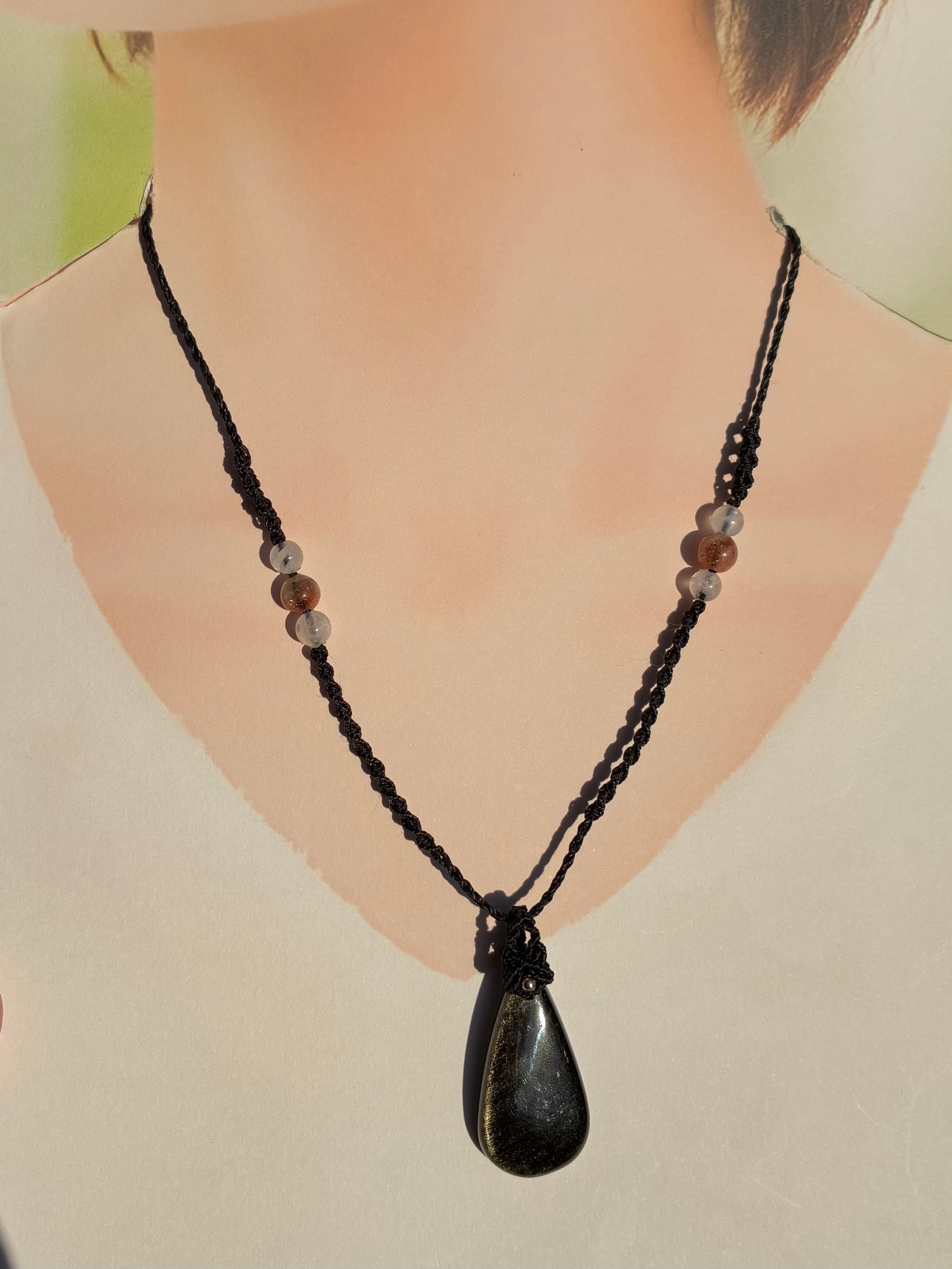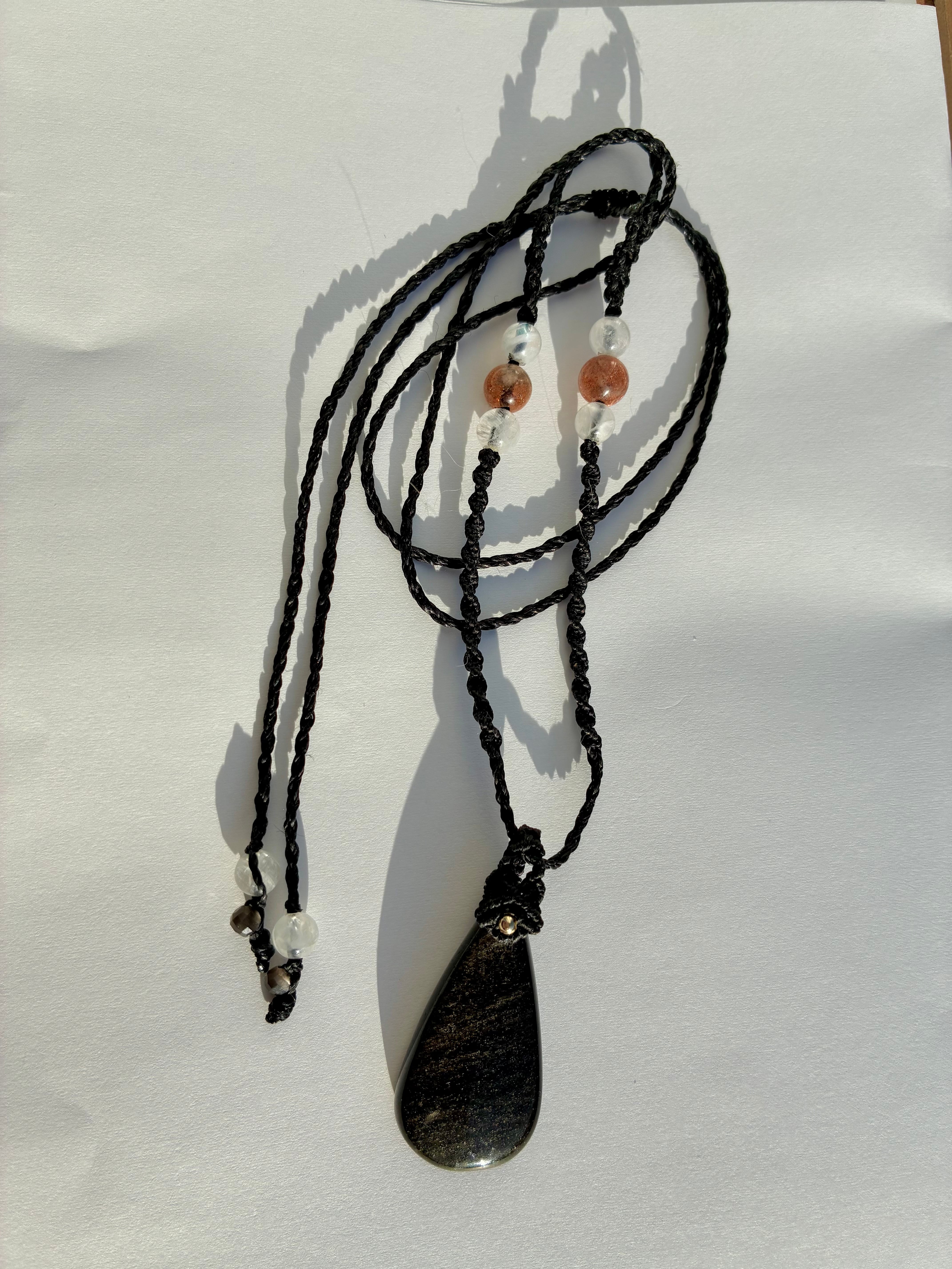 ゴールデンオプシディアン3.5×1.8㎝。サンストーン、ホワイトラブラドライト、オプシディアンビーズ使用。