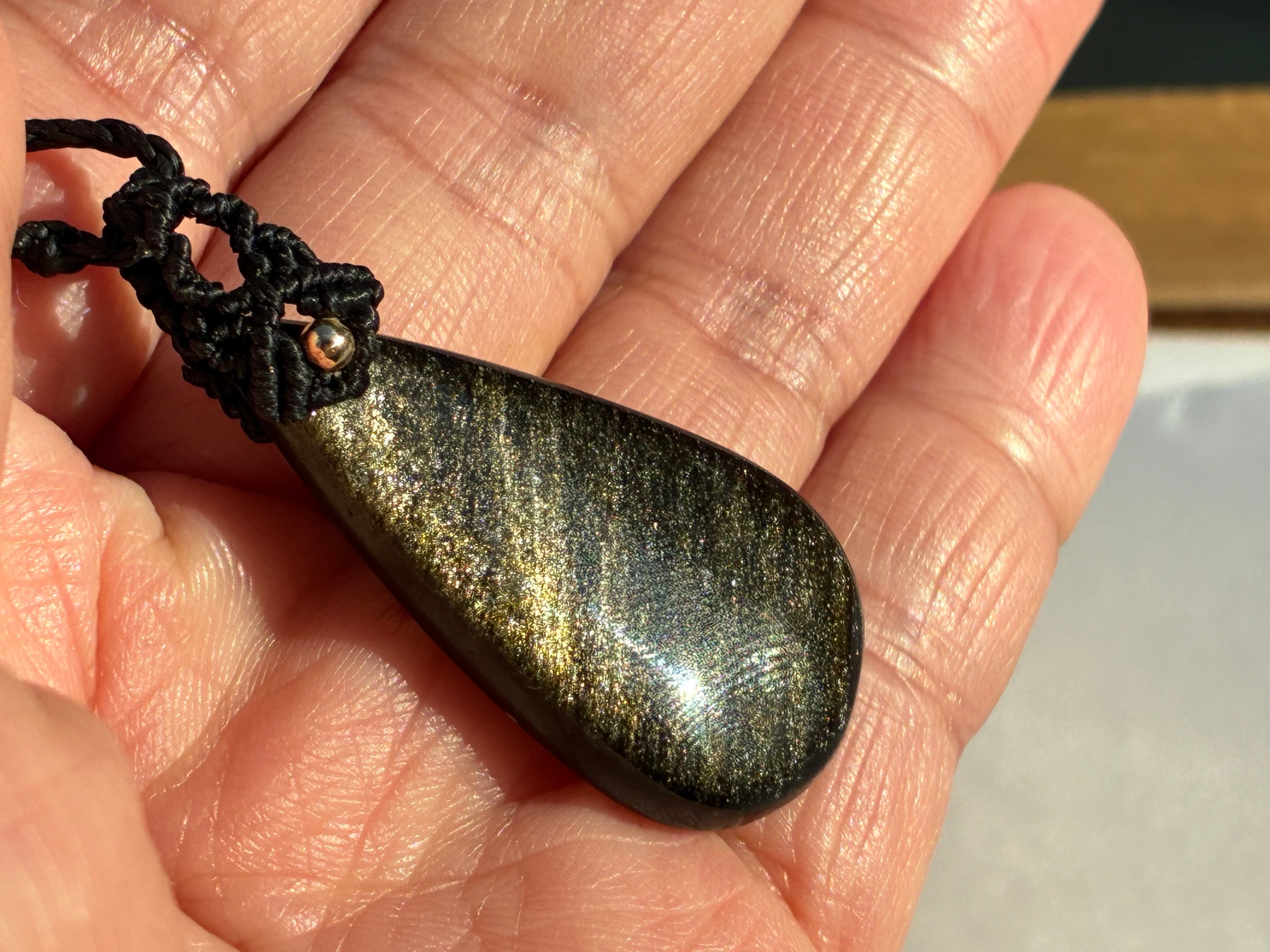 角度によってゴールドのシラーが美しく輝くゴールデンオプシディアンのペンダントになります。