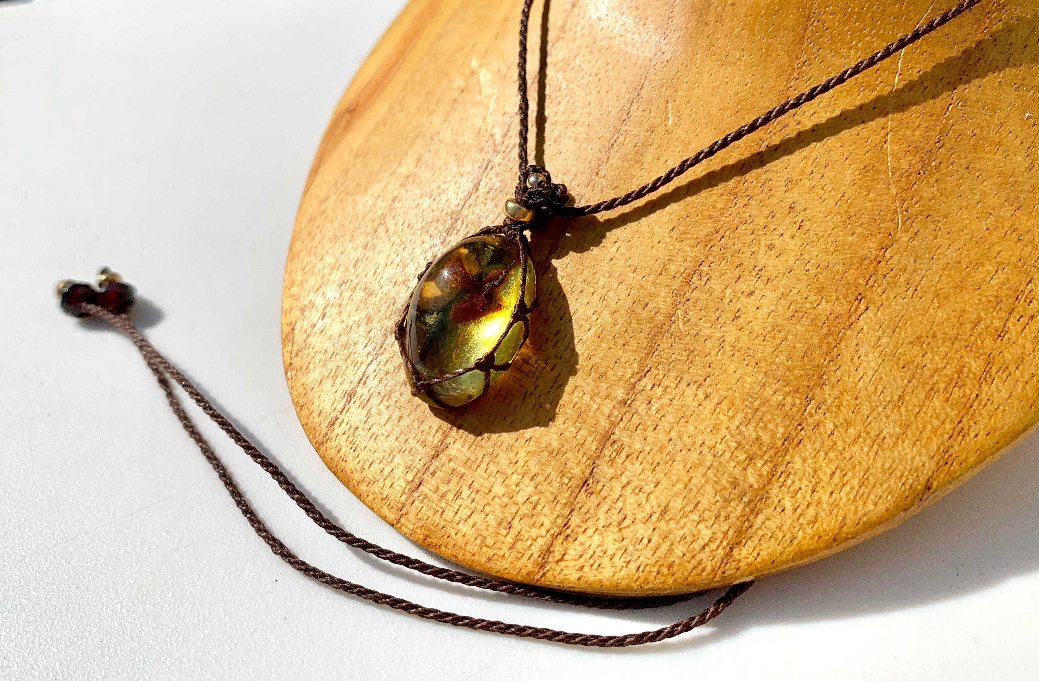 アンバー2.4×1.6㎝。14KGFパーツ使用。首紐の長さは80㎝ですが、アジャスターでお好きな長さに調節していただけます。