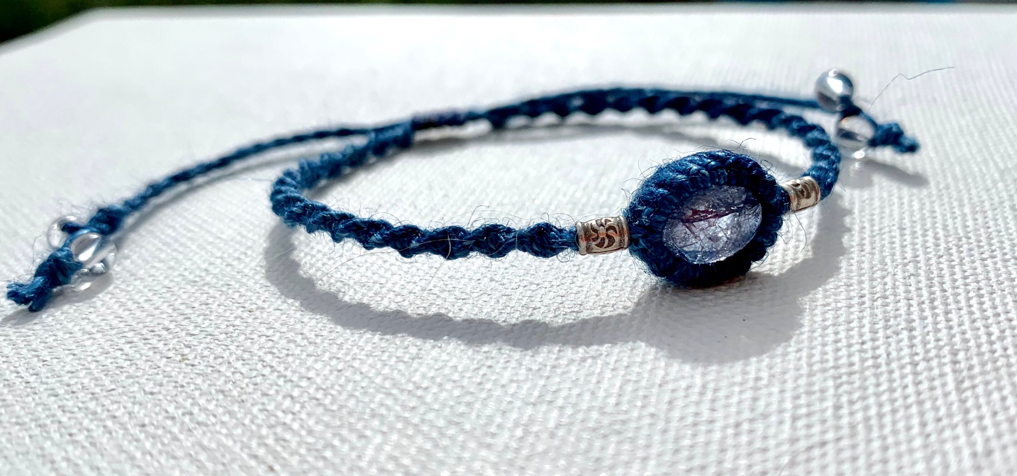 タンザナイトのブレスレットです。藍染の麻糸で編み上げています。