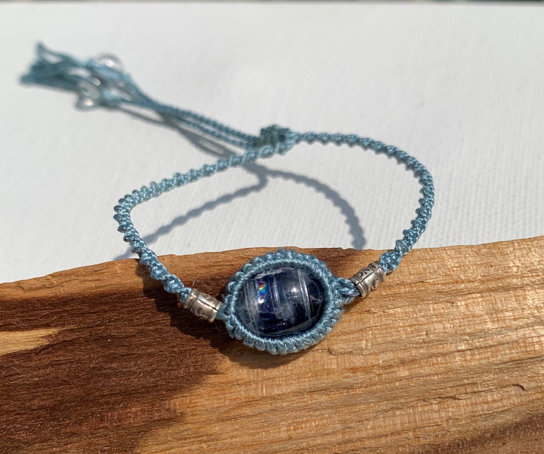カイヤナイトの藍染シルク糸のブレスレットです。カイヤナイト(ネパール産)は固定概念を外したり悪習慣を遠ざけることによって、持つ人の世界観を確立する事を助ける石と言われています。