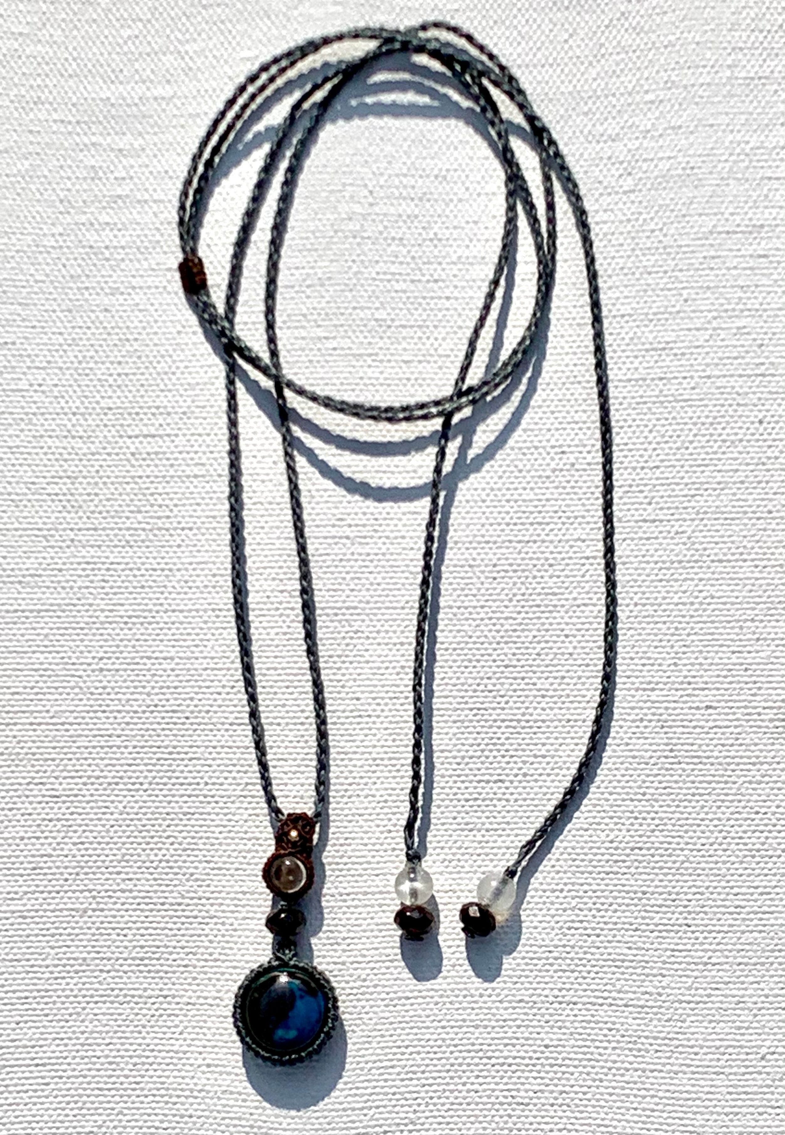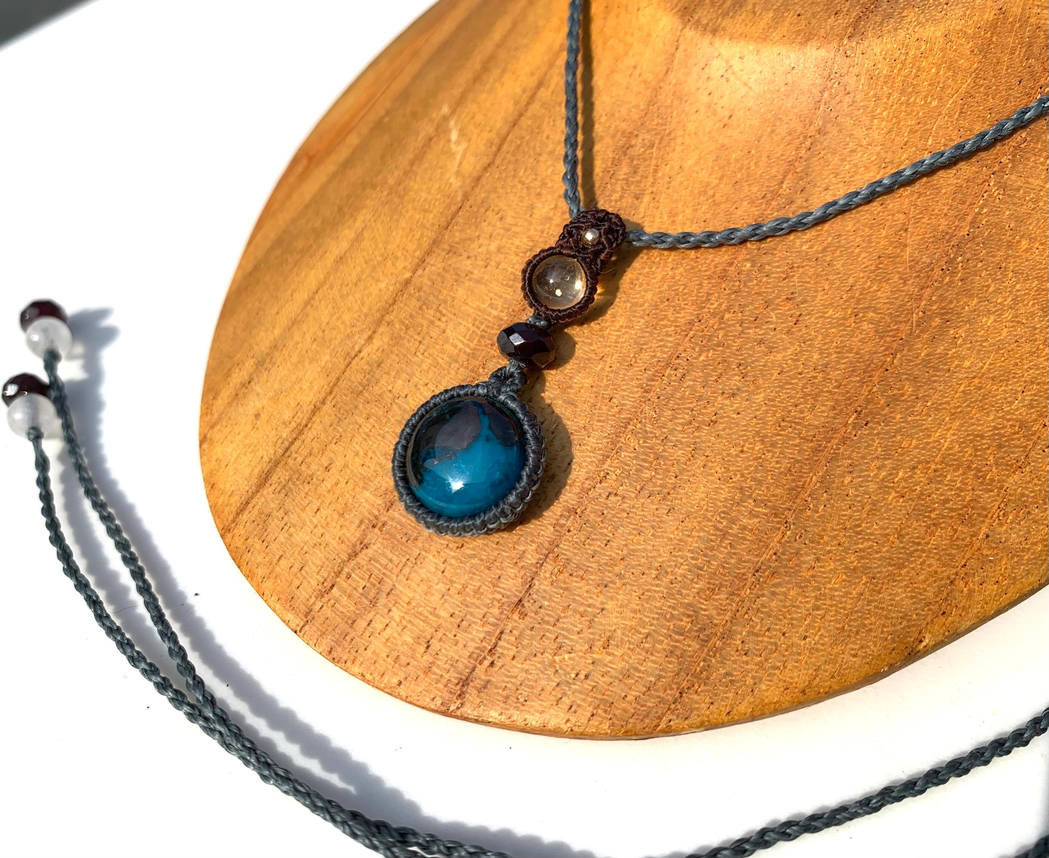 クリソコラ1.4×1.4㎝ シトリン0.6×0.6㎝。トップの長さは3.8㎝。ガーネット、レインボームーンストーン。
