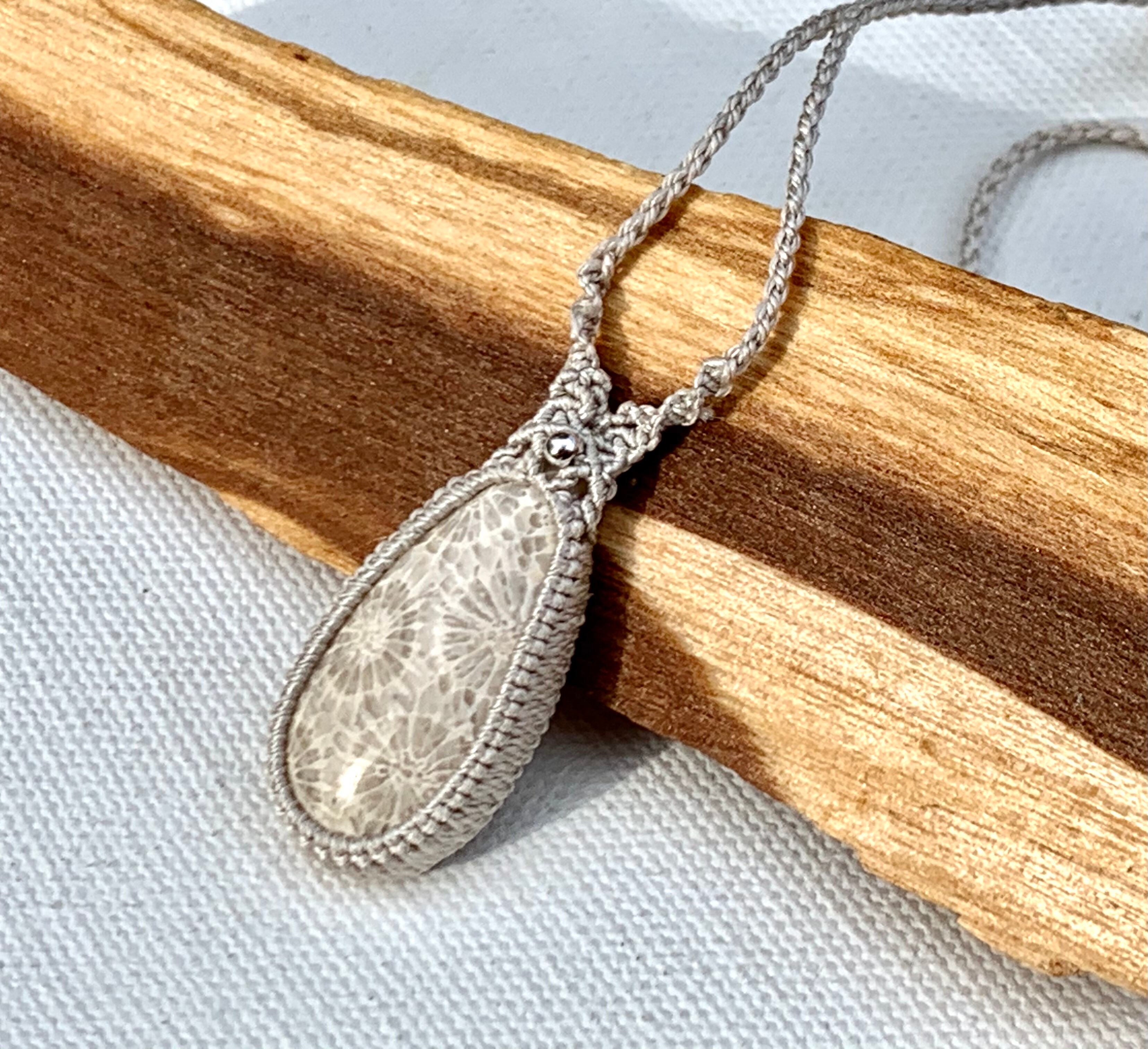 フォッシルコーラルのシルク糸(ローズヒップ染め)ペンダントです。