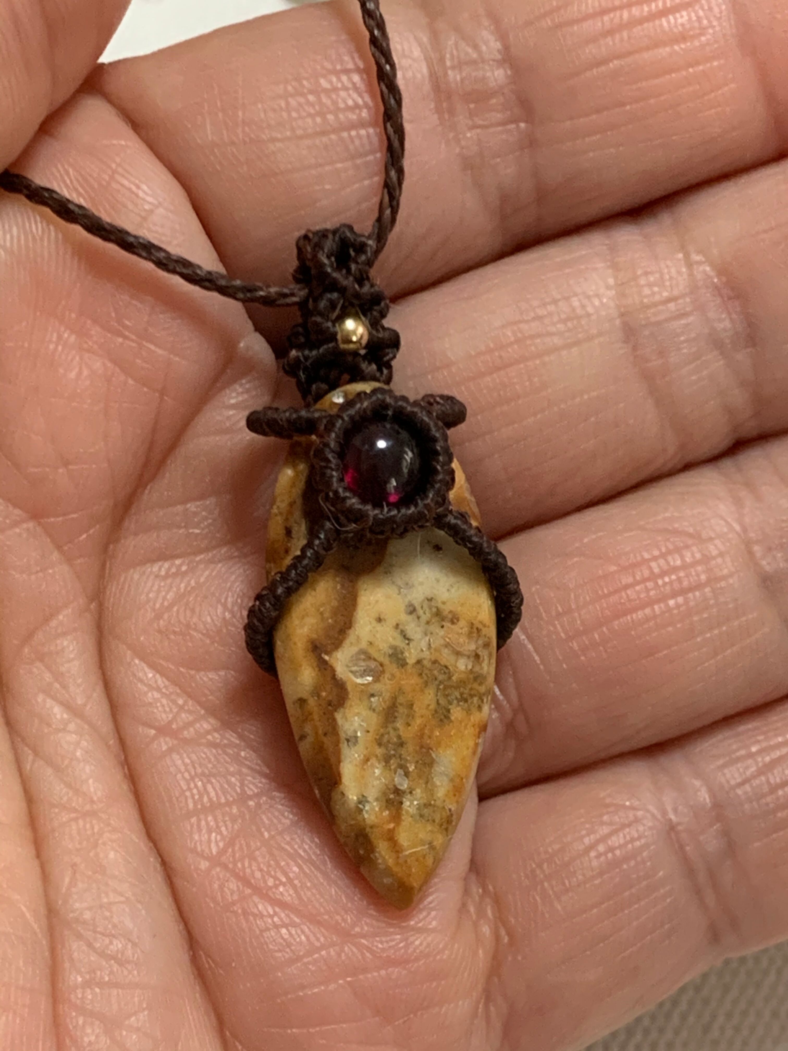 姫川薬石3.1×1.5㎝。ガーネット0.8×0.8㎝14KGFビーズ使用。水晶。首紐の長さは80㎝ですが、アジャスターでお好きな長さに調節していただけます。