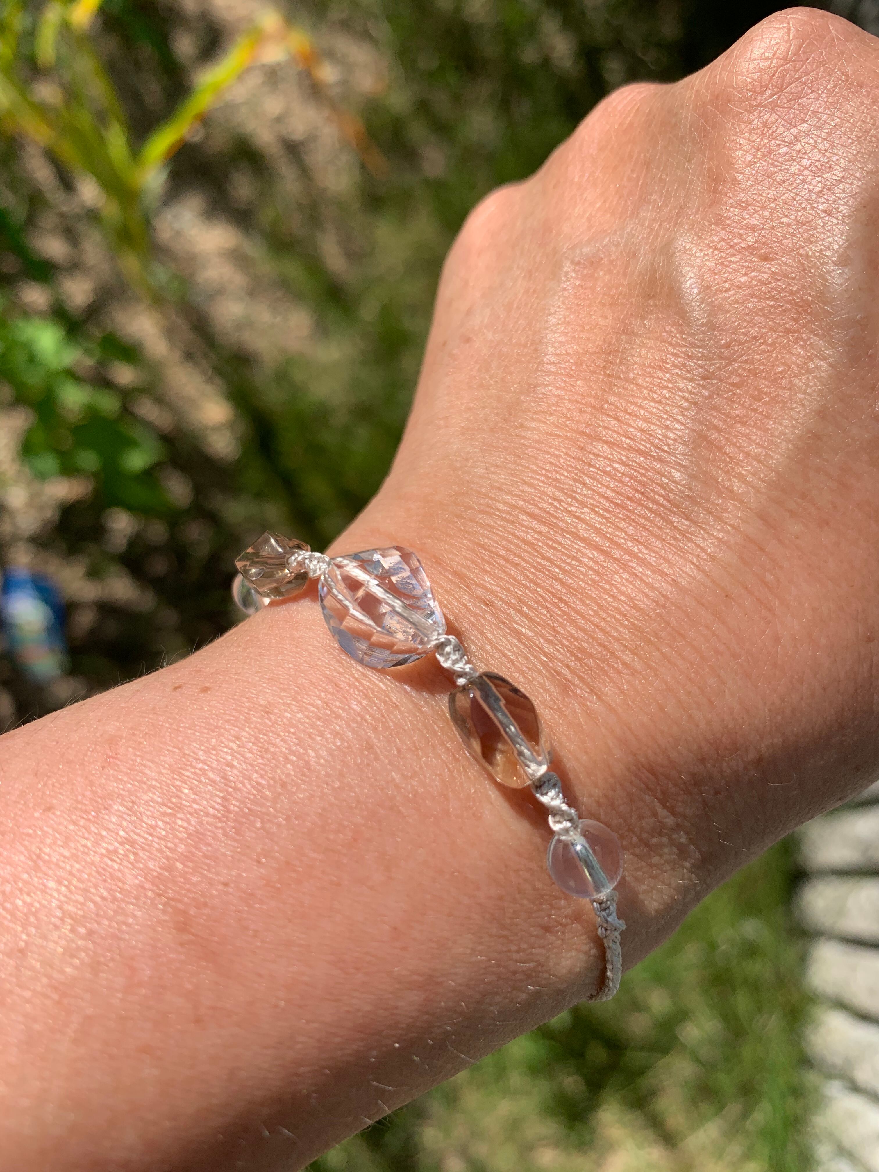 カットタイプのクリスタルとスモーキークォーツのシルク糸(ローズヒップ染め)ブレスレットです。