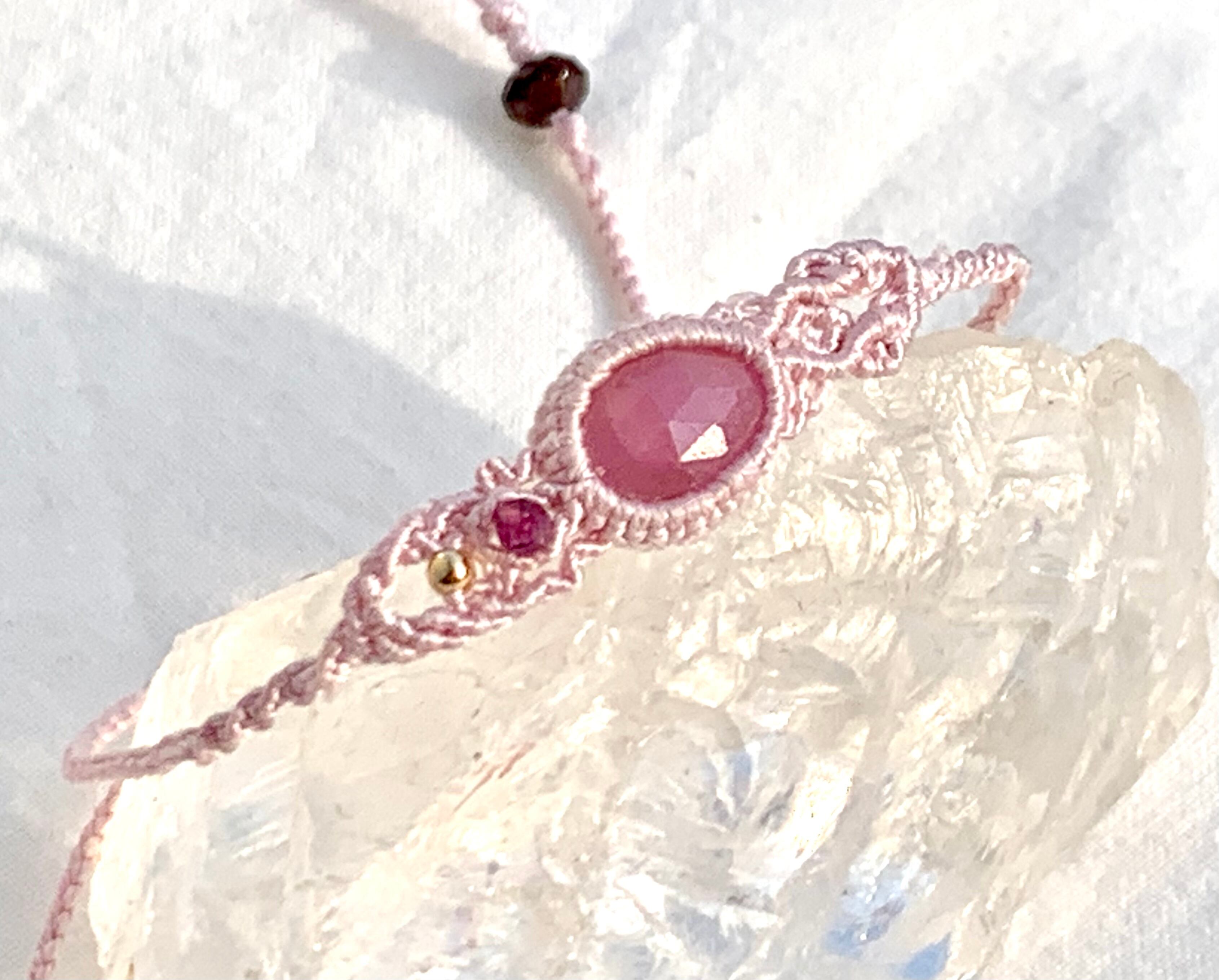 サファイアのシルク糸(コチニール染め)のブレスレットです。ファセットカットのキラキラ輝くサファイアにガーネットのビーズを合わせアシンメトリーに編み上げました。