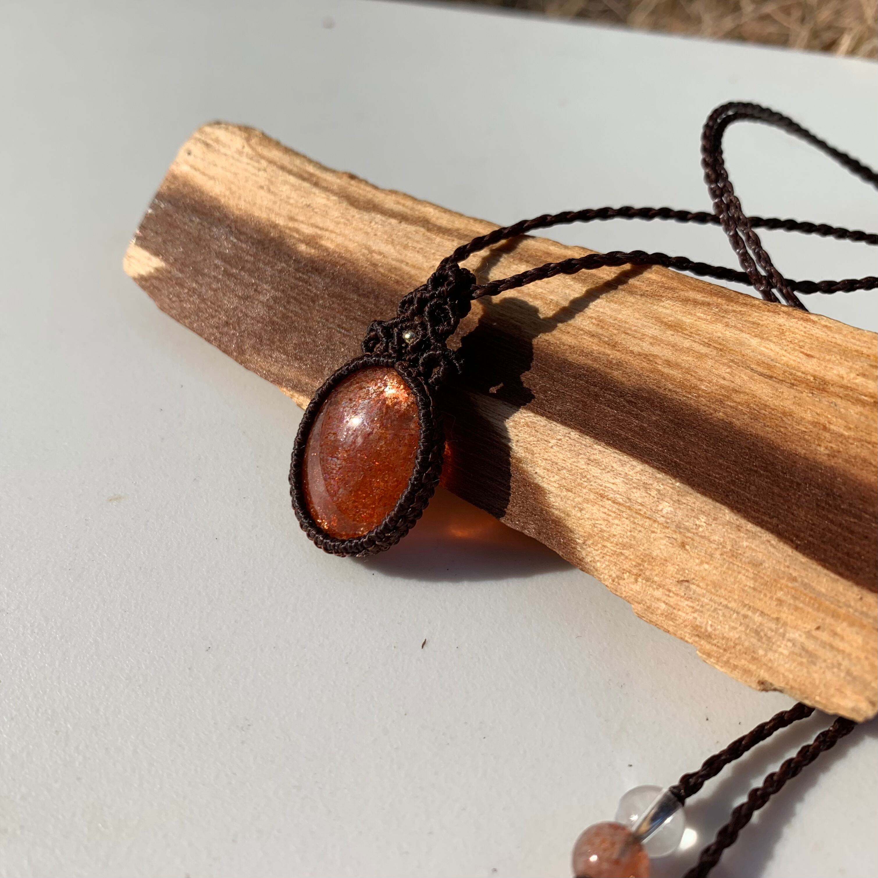 大ぶりでギラギラと輝くサンストーンをシンプルにペンダントに編み上げました。