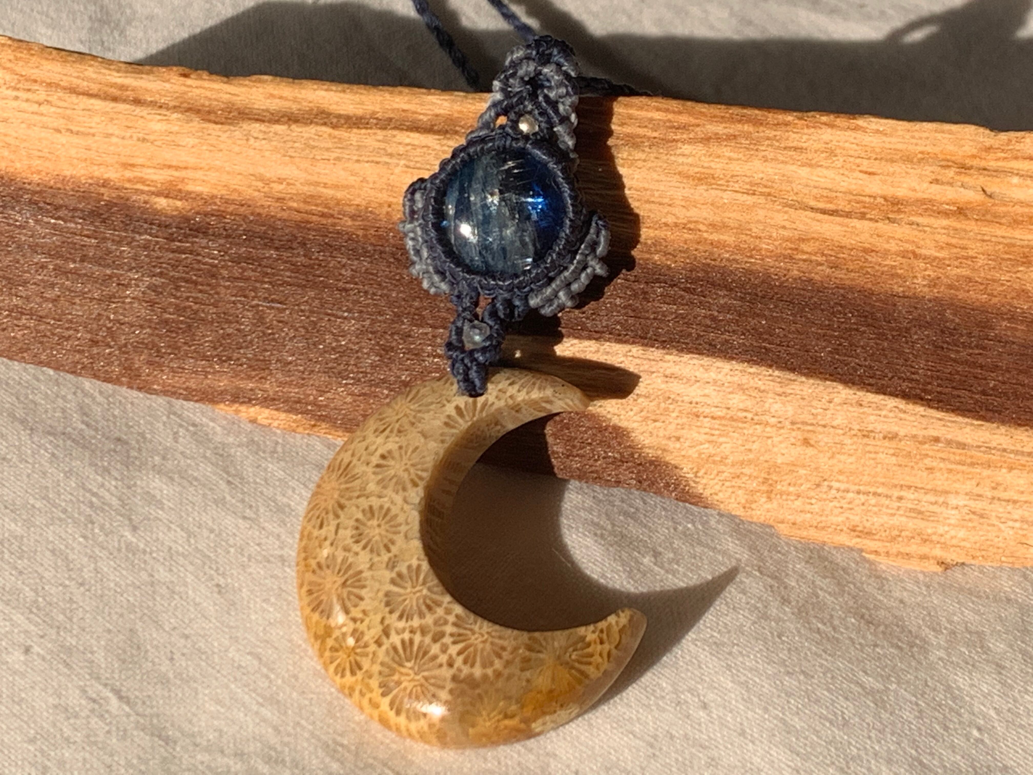お月様型フォッシルコーラルとカイヤナイトの連結ペンダント