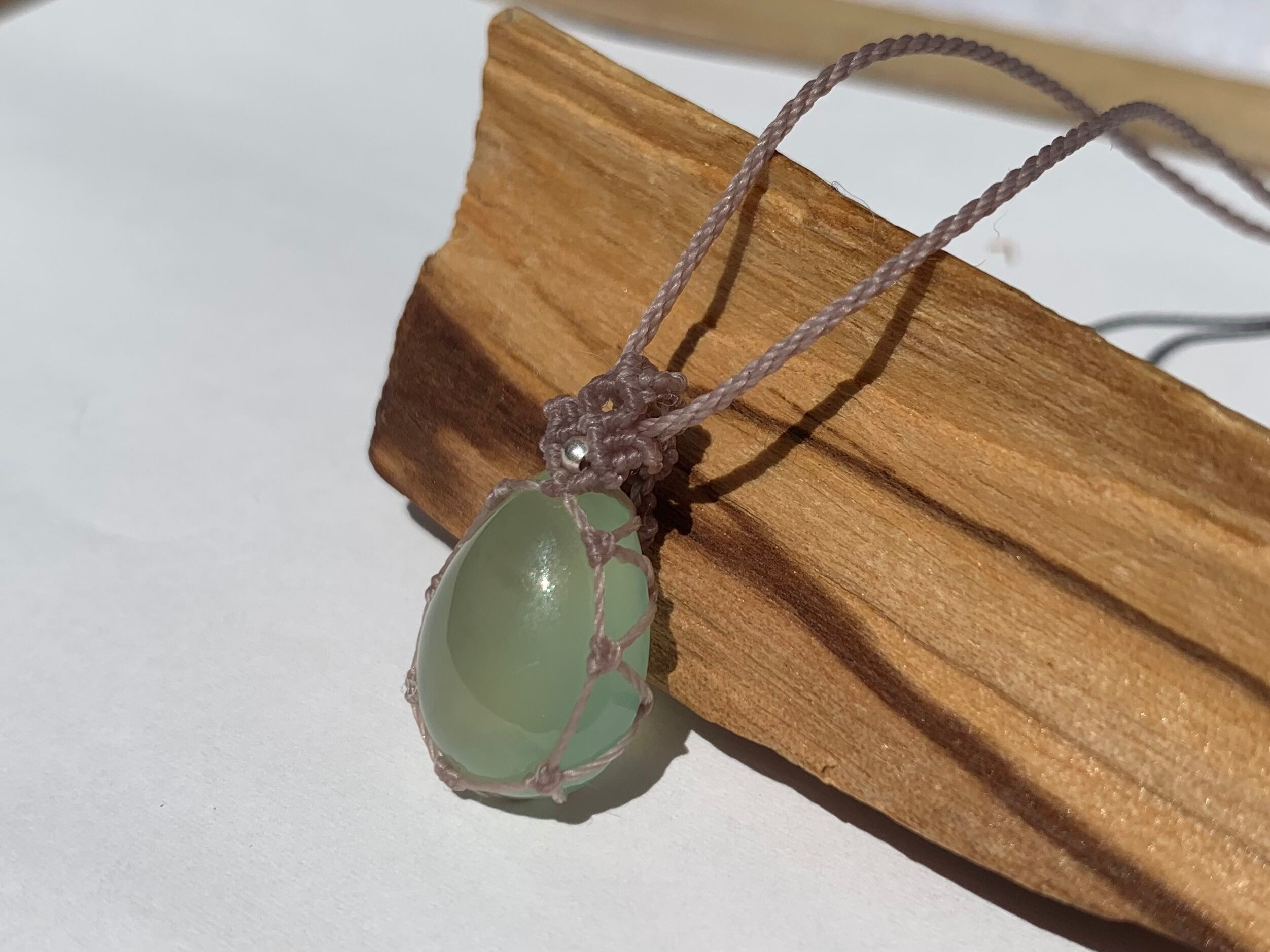 ぷっくりと美しいプレナイトをシンプルに編み上げたペンダントになります。