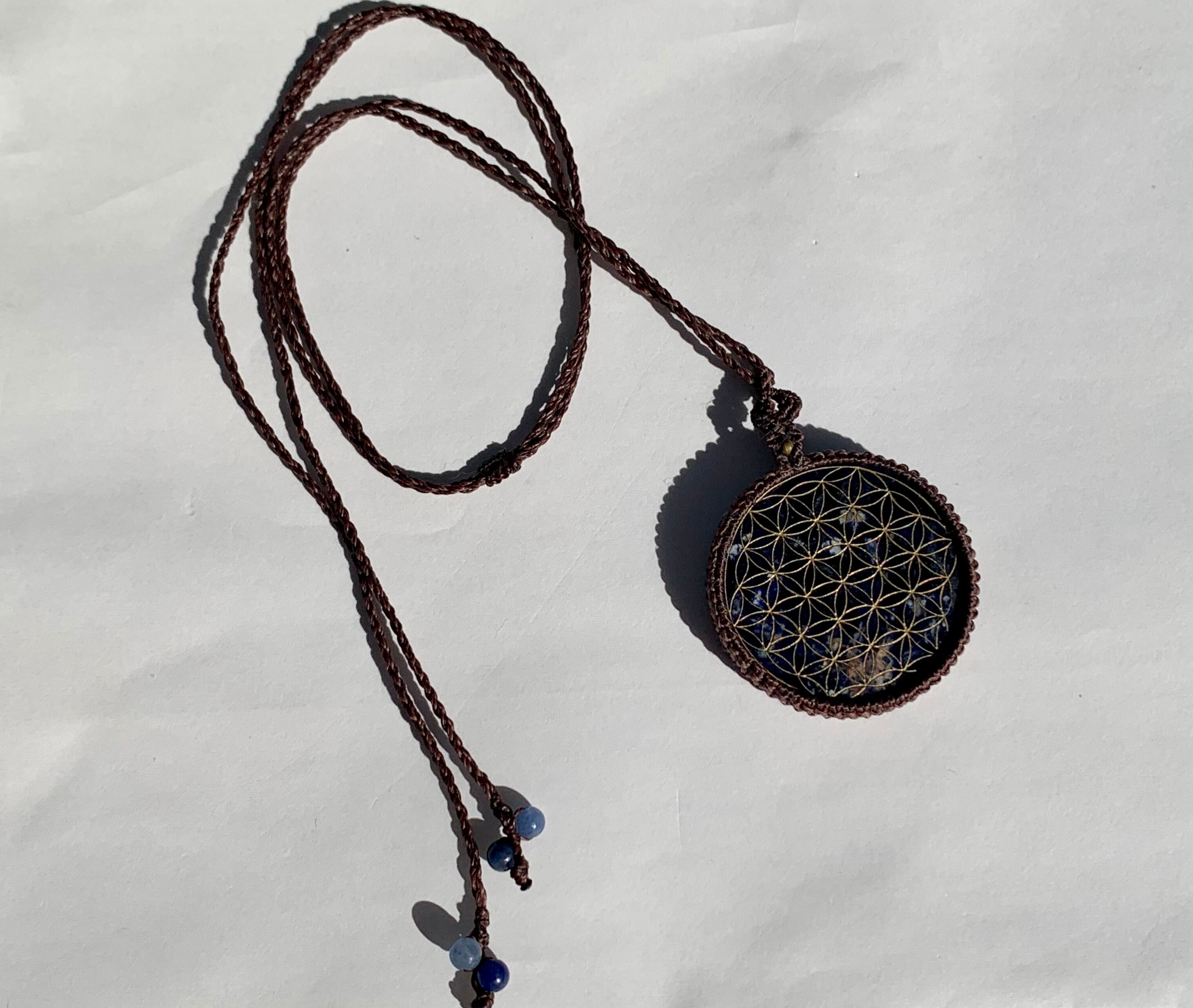 フラワーオブライフ(石はソーダライトになります)のペンダントです。シンプルに編み上げました。